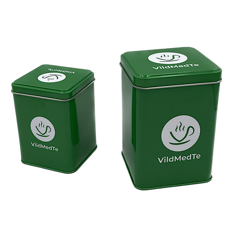 Stilren tedåse i flot grøn farve med vores VildMedTe logo.